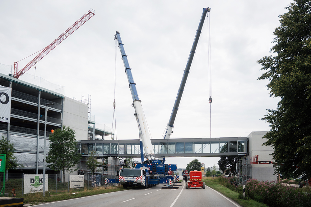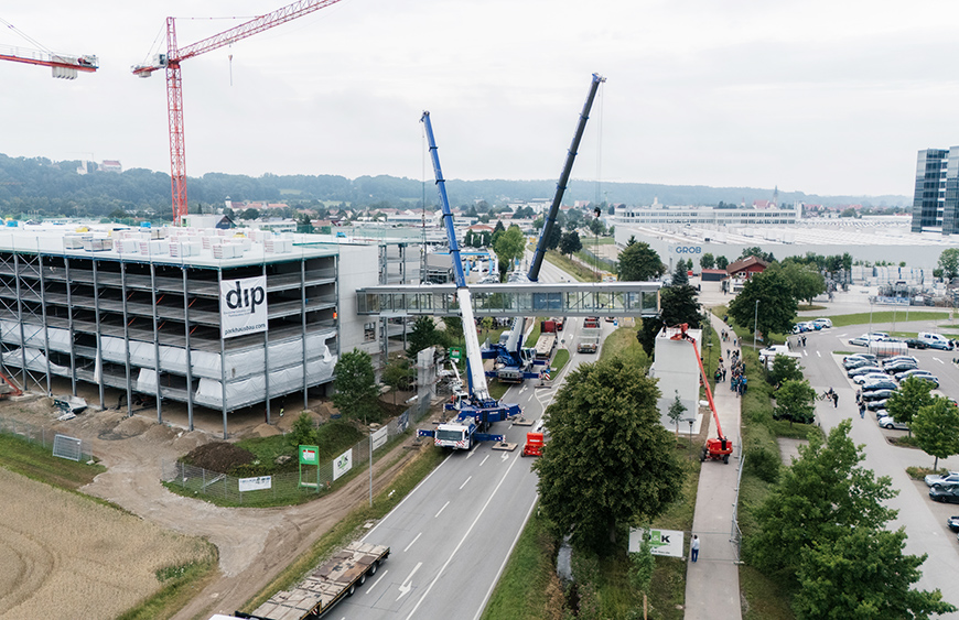“We are delighted with the successful installation of the pedestrian bridge. It marks a significant milestone in the construction of our parking garage and makes an important contribution to providing our colleagues with a safe and direct route to their workplace,” explains Wolfgang Schuster, Head of Building and Property Management at GROB.