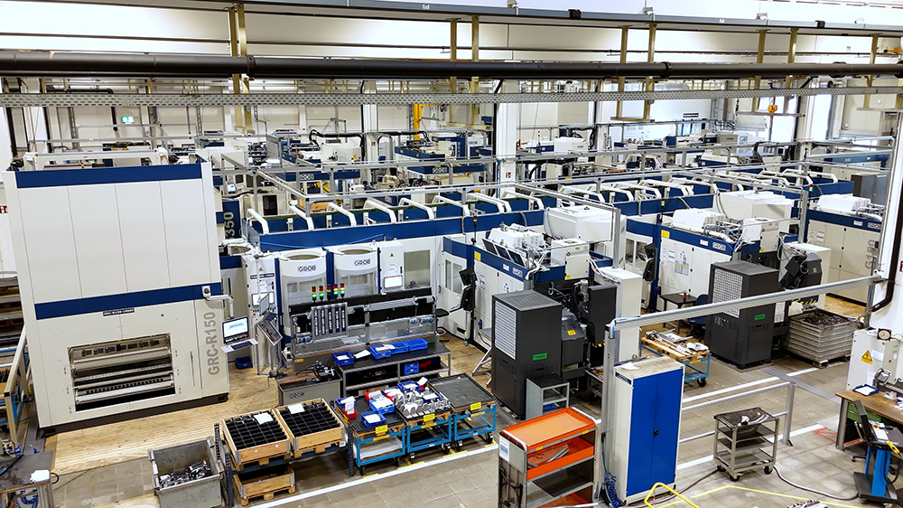 Das Ergebnis ist eine flexible Automationslösung, die gleich mehrere GROB-Produkte vereint: Das Palettenlinearspeichersystem PSS-L450 übernimmt das Palettenhandling, die Roboterzelle GRC-R150 kümmert sich um das Teilehandling, und drei Universalmaschinen des Typs G150 wurden im Rahmen eines Mastermaschinenkonzepts mit speziellen Spannvorrichtungen integriert. Komplexe Spannvorrichtungen werden manuell über das PSS-L450 gespannt, während kleinere und größere kubische Bauteile von der Roboterzelle automatisch gehandhabt werden. Eine zusätzliche Schraub- und Prägestation innerhalb der Roboterzelle automatisiert weitere Arbeitsschritte und sorgt für noch mehr Effizienz.
